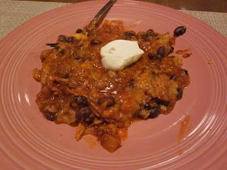 It may not look very pretty, but it was tasty. There are two things I would do different: I would use less sauce (I used a 24 ounce can of enchilada sauce, but I think I needed about half that) and more tortillas in layering. For some reason I used two tortillas on the bottom, but when I layered I only used one. So the tortilla kind of disintegrated and was invisible during consumption. Definitely should have used two tortillas for each layer. Oh, and more cheese. I only used cheddar, but I think I might use a mexican blend of cheese next time, and more of it.